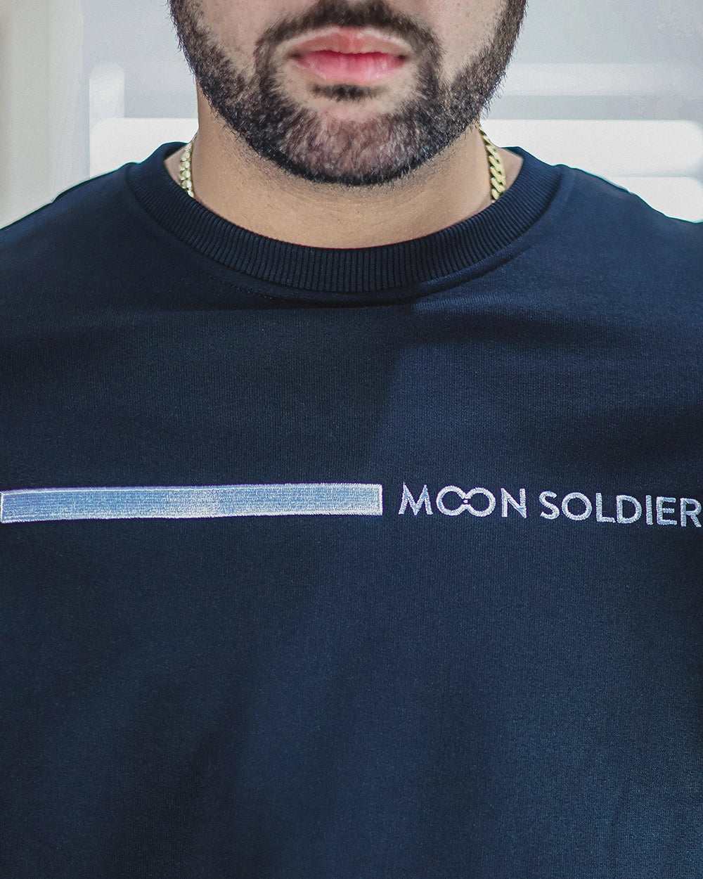 Close-up of Moon Soldier black sweatshirt with minimalist vertical linear logo design.