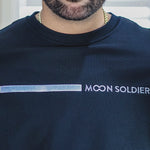 'Moon Soldier Linear' Soft Cotton Crewneck Sweatshirt. This black sweatshirt features a sleek white linear design and subtle Moon Soldier branding. With a classic crew neck and long sleeves, it offers timeless appeal, perfect for any season.